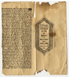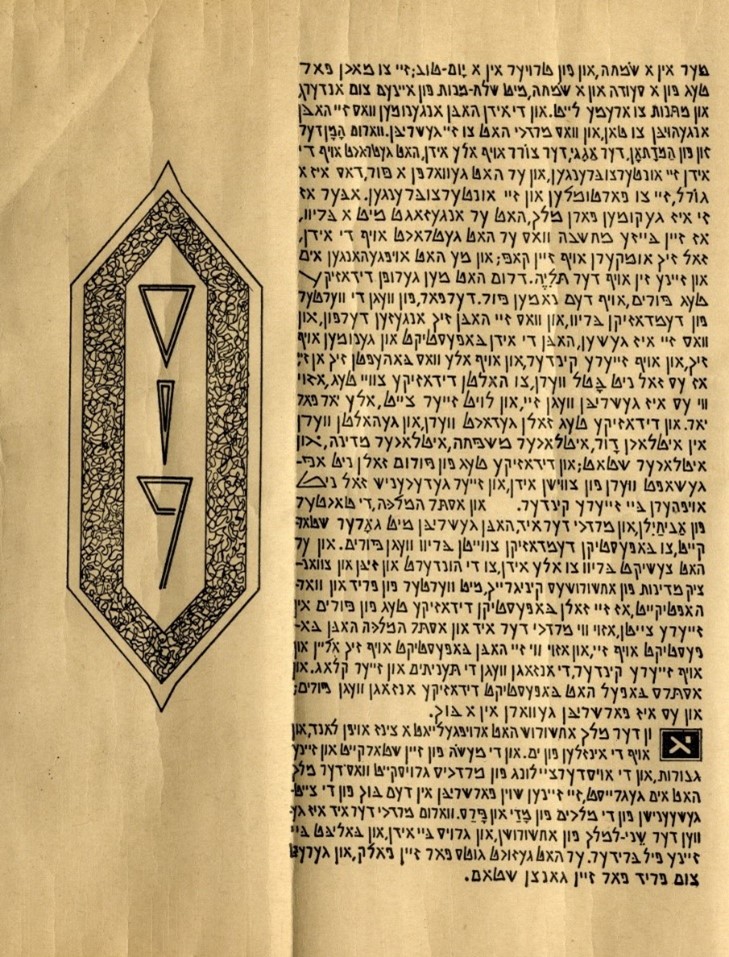 The topics of writing and language are woven throughout the Book of Esther. King Ahashverosh sent his announcements and decrees in the “script and language” of each province and people to his subjects in the 127 states of his Persian kingdom.The first instance of a pronouncement of this type almost sounds like a Purim spoof – in response to Queen Vashti’s insubordination, Ahashverosh proclaimed that every man should be ruler of his home and speak his native language. This proclamation is not “written and sealed with the king’s ring,” unlike the life and death diktats later in the megilah.The order to annihilate the Jews was dispatched in the usual format, in the “script and language” of each nation and people, with the addition that the missive is sealed with the king’s ring ;  the decree overriding the death sentence of the Jews of Persia includes the king’s signet and adds a new element: “and to the Jews in their script and language.”Since the subject of language is paramount on Purim, and the Book of Esther may be read in any language, it is apropos that a unique Yiddish megilah exists, printed in the form of a scroll. The Yiddish translation is by the famed Yiddish poet Yehoash (Solomon Bloomgarden; 1872–1927), who translated the Bible into Yiddish. The calligraphy is by his daughter, Evelyn (Chava)  Yehoash Bloomgarden Dworkin, an artist.  The Yiddish attribution of the nature of Dworkin’s work, געכתיבהט , [ge-ksivht] indicates that the letters were written in block letters, rather than the current standard cursive letters. Dworkin designed the angular letters, “combining modern faux-archaic fonts to create a style reminiscent of ancient Hebrew script.”The megilah was published in 1936, by the Yehoash Publication Society and distributed by the Society as a gift, to encourage donations to  fund publication of Yehoash’s complete Bible translation in a bilingual (Hebrew – Yiddish) edition.  The Hebrew – Yiddish Bible was published in 1936 and was dubbed the “people’s Bible.” It was meant to be a popular, accessible edition; it has been reprinted many times.Although the Yiddish megilah is printed on paper, and thus not kosher for ritual use on Purim, the library’s copy has creases in it, as if it had been folded in the traditional manner.  Before the megilah is read in the synagogue on Purim, the scroll is folded to resemble a letter,  in recognition of the  igeret, the  letter,  which Esther and Mordecai sent to the Jews about commemorating Purim.   Perhaps this Yiddish megilah served as a “people’s megilah,” a way for someone to participate in the experience of using a scroll while enjoying the mellifluous modern Yiddish translation rendered in spare, handsome lettering, evocative of the spirit of centuries of Jewish history and languages.